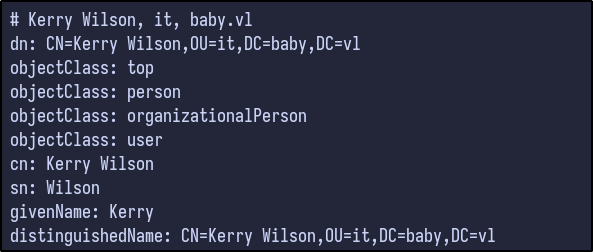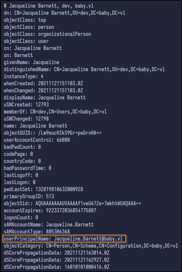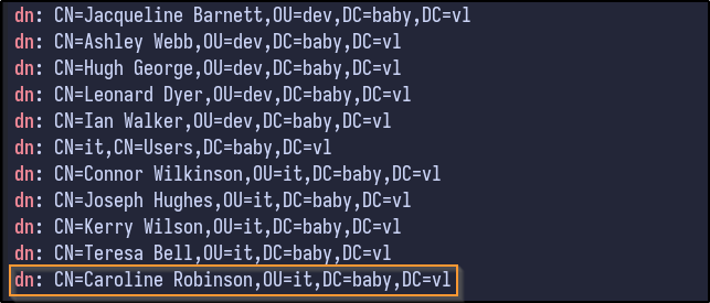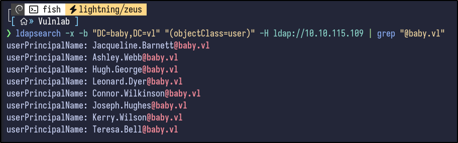 ldapsearch -x -b "DC=baby,DC=vl" "(objectClass=user)" -H ldap://10.10.115.109 | grep "@baby.vl"