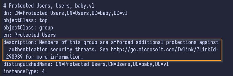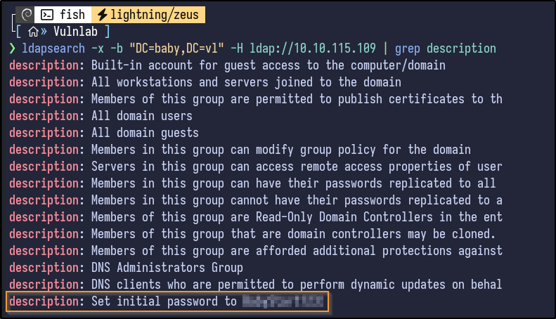 ldapsearch -x -b "DC=baby,DC=vl" -H ldap://10.10.115.109 | grep description