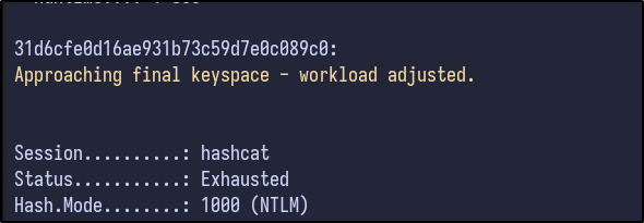 Hashcat was attempted but results in no hash cracked for the Administrator account:
