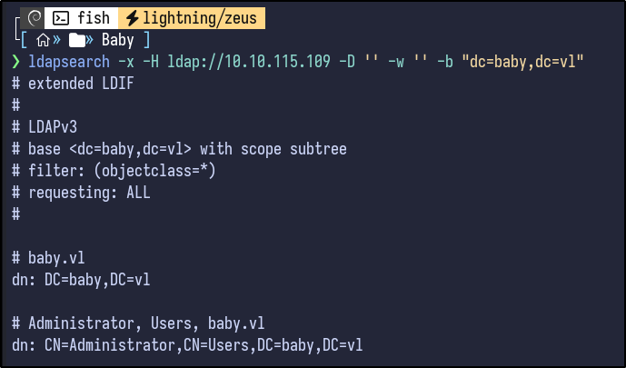 ldapsearch -x -H ldap://10.10.115.109 -D '' -w '' -b "DC=baby,DC=vl"