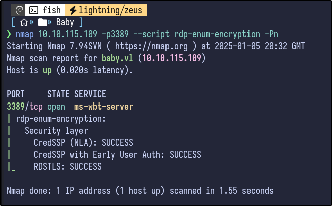 nmap 10.10.115.109 -p3389 --script rdp-enum-encryption