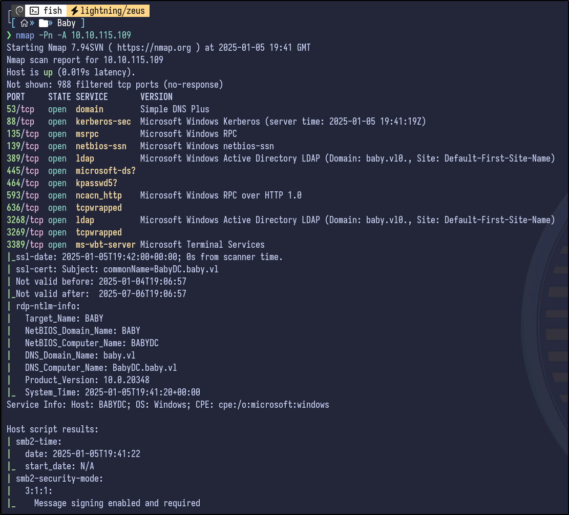 Common ports for an Active Directory environment, and specifically a Domain Controller are open, including Kerberos, DNS, LDAP, SMB and RDP. Adding the hostname to the /etc/hosts so a DNS name can be used going forward: