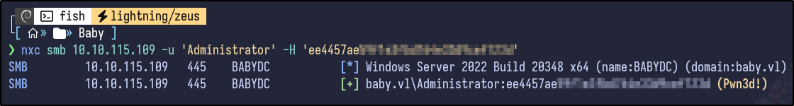 Passing the hash via NetExec reveals it is valid and the domain is pwned: