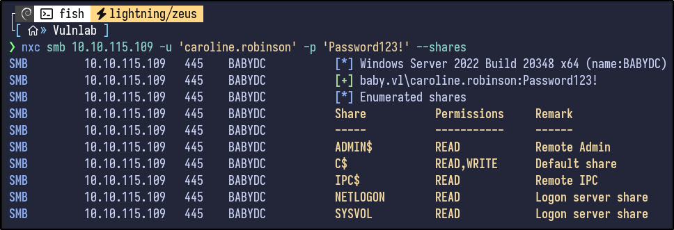 nxc smb 10.10.115.109 -u 'caroline.robinson' -p '[PASSWORD]' --shares