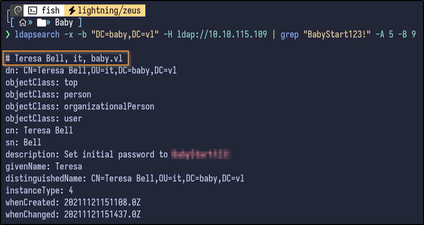 ldapsearch -x -b "DC=baby,DC=vl" -H ldap://10.10.115.109 | grep "[PASSWORD]" -A 5 -B 5