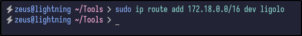 sudo ip route add 172.18.0.0/16 dev ligolo