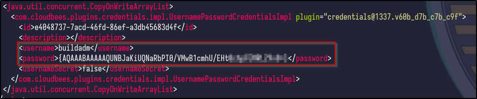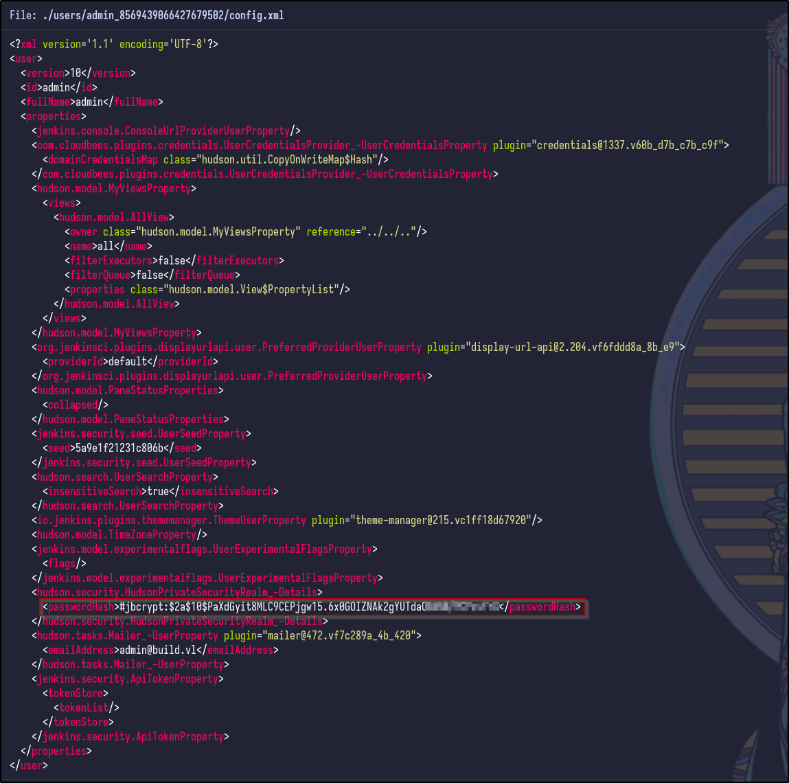 It appears nothing is returned for the admin user. However, looking at the other config.xml files under the jobs/build directory results in another hash for the buildadm: