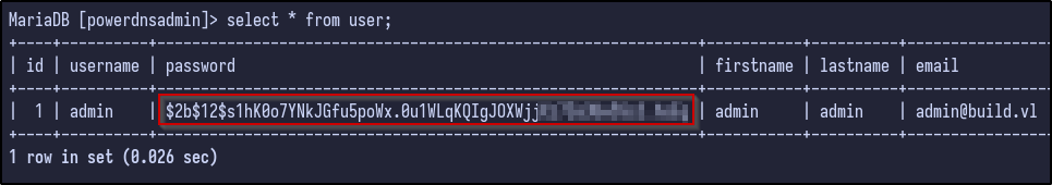 Again, there are many interesting tables including account, domain_apikey, records and so on but user may contain valid password hashes for users. Selecting all the information from the user table reveals just that - a password for the admin user: