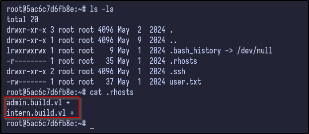 Enumerating the root user’s home folder, there is a .rhosts file that contains two entries:
