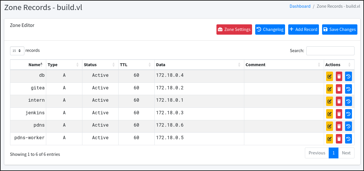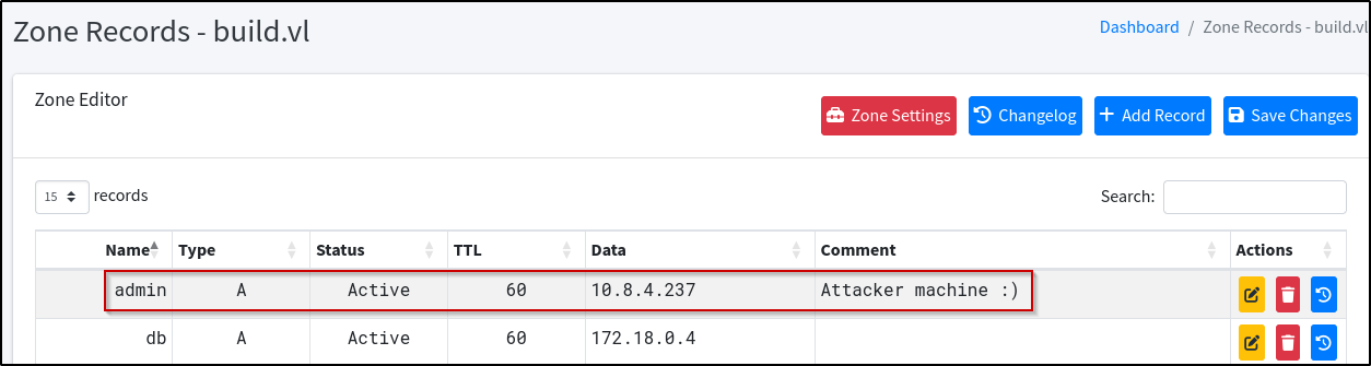 In PowerDNS, there is an A record for the intern record but no record is present for the admin subdomain. With this in mind and knowledge of how .rhosts work, a new DNS entry can be added that points the admin.build.vl record towards our attacker machine IP and save the changes:
