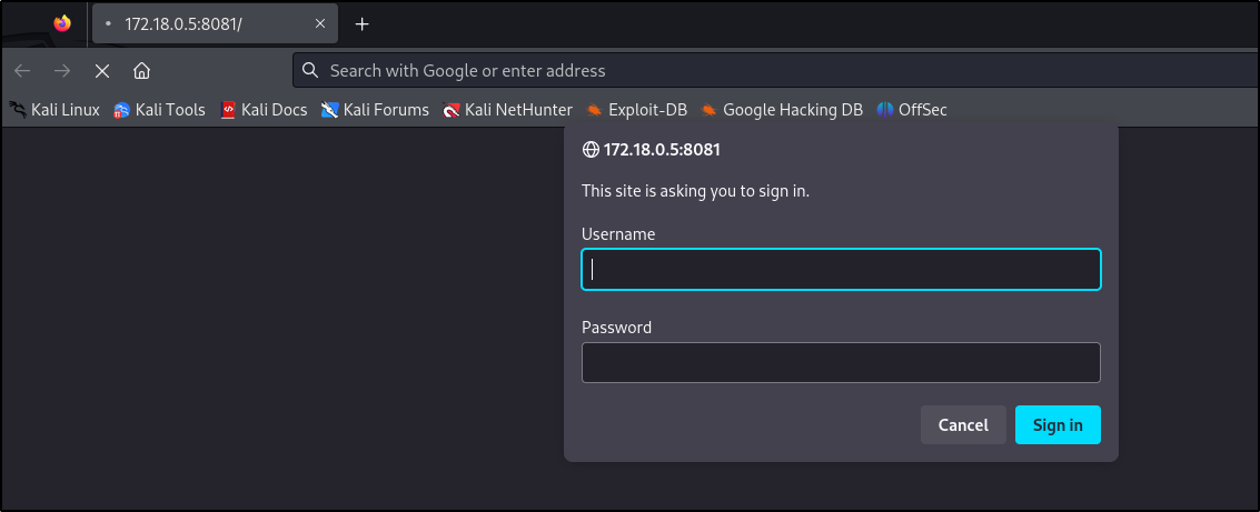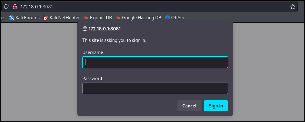 Above, it appears the two ports that were initially filtered (3306, 8081) are now open since we have access to the internal IP. Navigating to the 172.18.0.1:8081 web server running prompts for authentication: