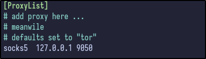 To use port 9050 as a socks5 proxy, modify the /etc/proxychains4.conf file and add the following line at the end to set the proxy to localhost port 9050: