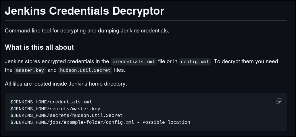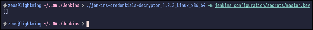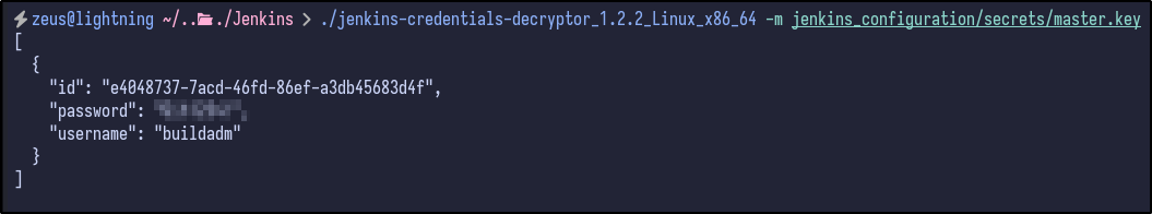 ./jenkins-decryptor -m [MASTER.KEY] -s [HUDSON-SECRET] -c [CONFIG XML] -o json