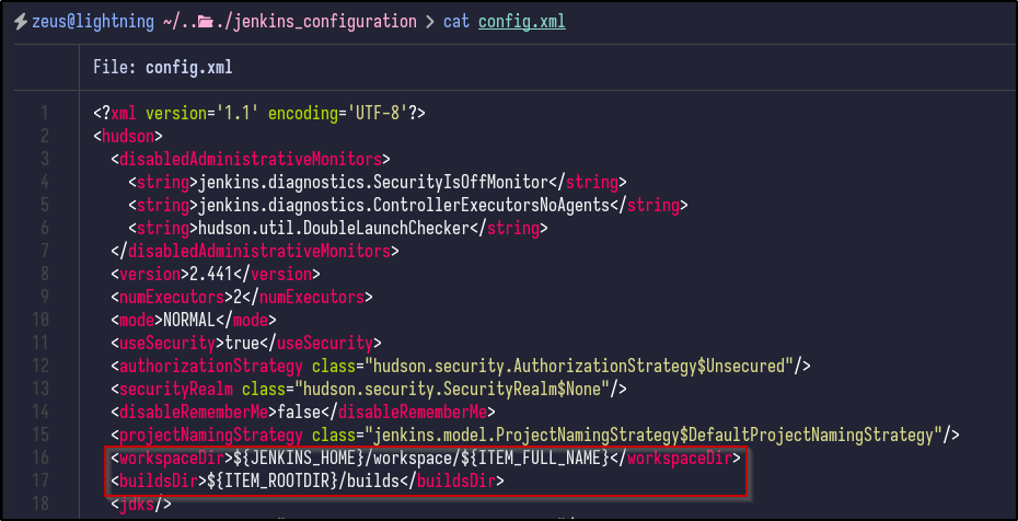 Looking through, there is a config.xml in the base directory which appears to contain no useful information to us right now, but does include the workspace and build directories: