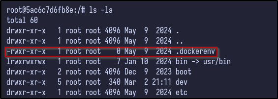 Immediately, it appears we are the root user on a Docker machine which can be confirmed via the presence of the .dockerenv file and the randomised hostname: