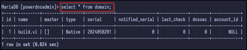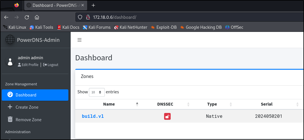 With the password, we can login to PowerDNS and gain full access to the admin account inside. Looking around at the dashboard, there is one entry for the build.vl domain: