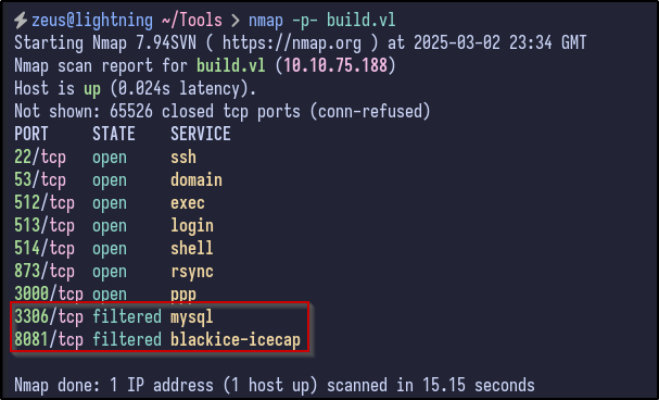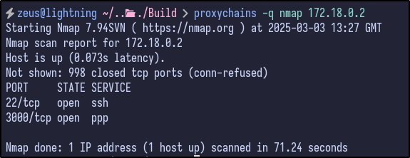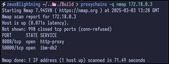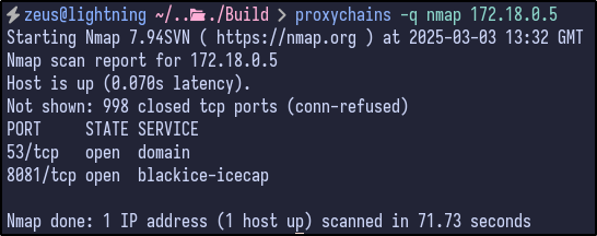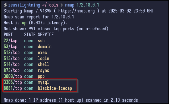 With networking knowledge, we can work out that the gateway for the Docker network is 172.18.0.1 (first host) and hosts/end devices would start from 172.18.0.2. Looking back at the Nmap, there were 2 ports that were filtered: