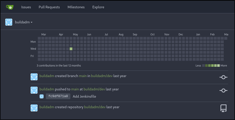 With valid Jenkins file, there may be password reuse across multiple services. For instance, the Gitea application running on port 3000. Attempting to use the credentials for the buildadm user works and login is successful: