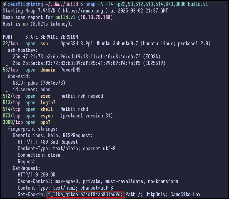 A few interesting ports appear including SSH, RServices (512,513,514) and port 3000. To gather more information, a detailed Nmap can be ran against the server: