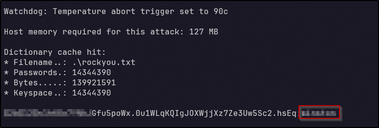 With this in mind and the admin password hash found earlier, the hash could potentially be cracked by running Hashcat against it. After a few minutes, a cleartext password appears and we have cracked the hash: