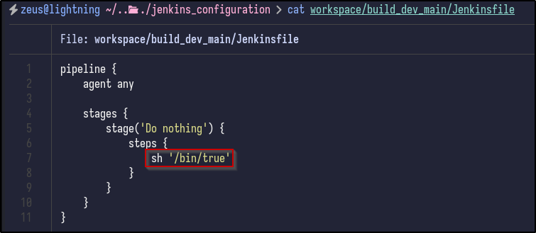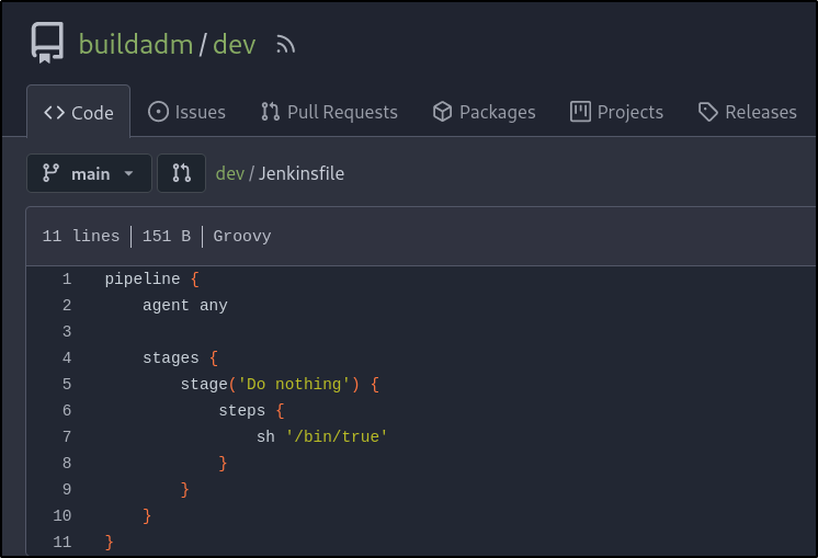 Checking the dev repository, there is a Jenkins file inside which contains the same content seen earlier: