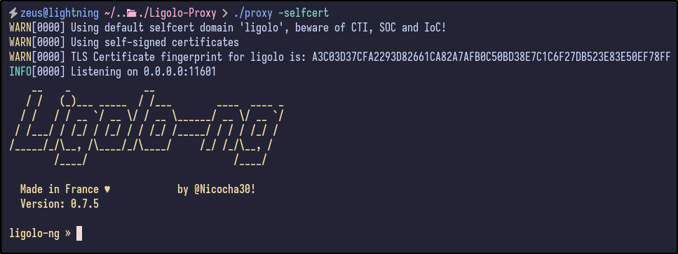 Once the network is set up, start Ligolo with the -selfcert option:
