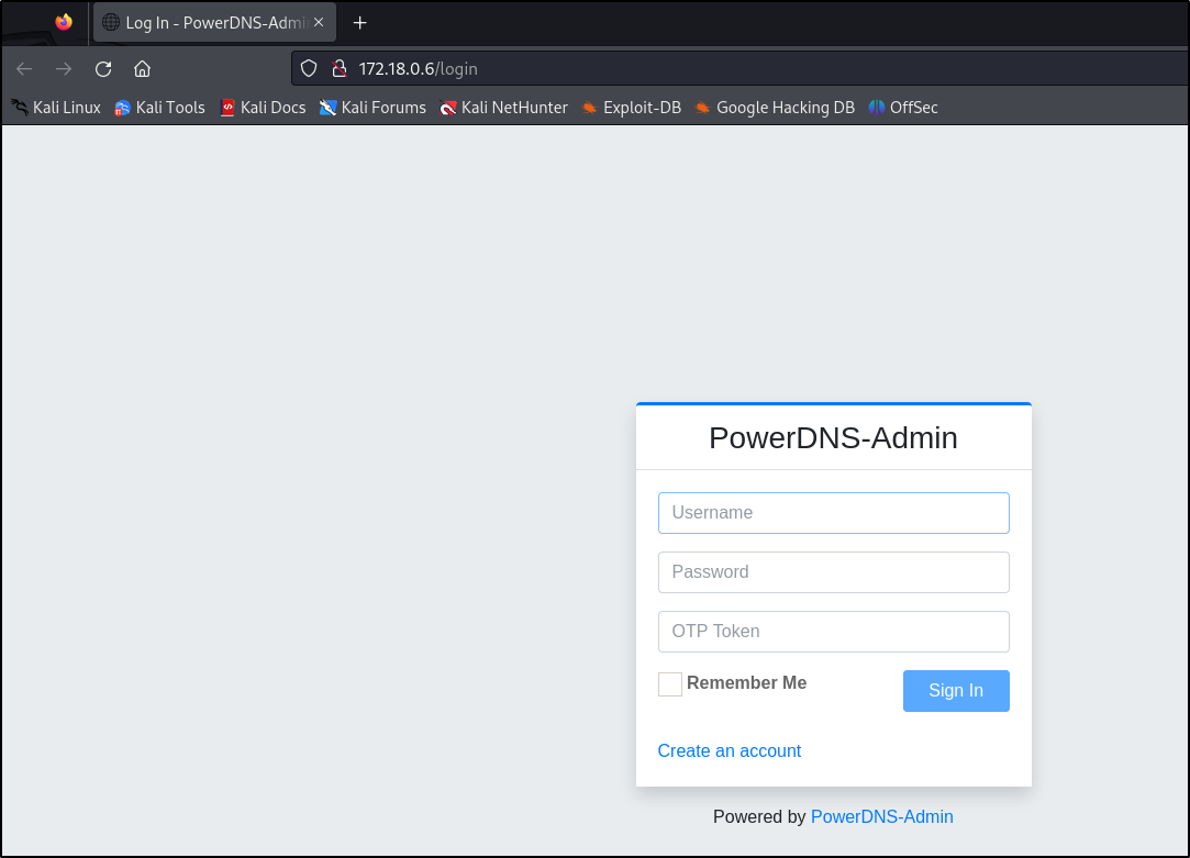 More interestingly, the last host 172.18.0.6 was operating a PowerDNS site, containing the initial login page for PowerDNS-Admin: