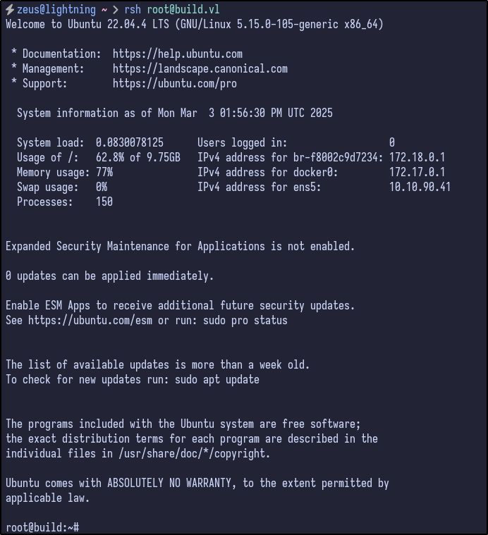 Since our machine is now admin.build.vl in PowerDNS, the .rhosts file entries will allow us to remote into the machine as it sees us as the admin.build.vl machine: