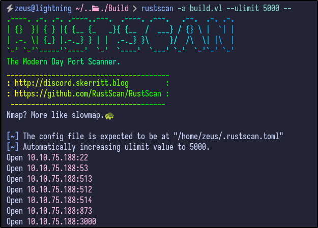 rustscan -a build.vl --ulimit 5000 --