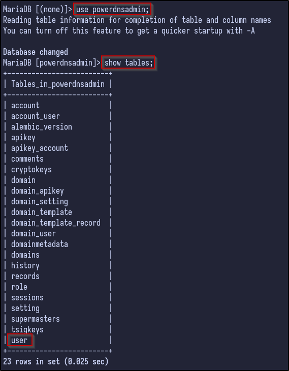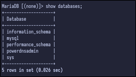 There are a few default databases, but one of particular interest to us is the powerdnsadmin database. The database can be selected and the tables can be dumped via the show tables command: