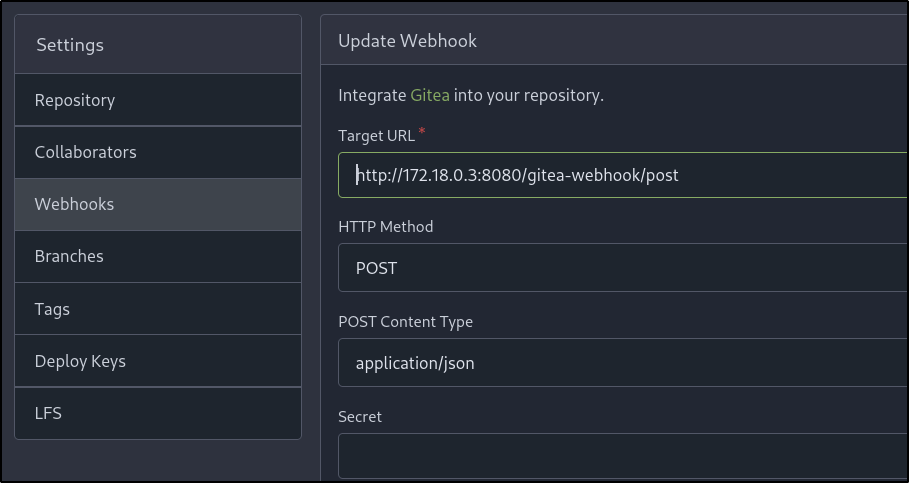 Looking further at the repository and its settings reveals a webhook in place that targets an internal Docker IP address (172.18.0.3) with the endpoint of /gitea-webook/post: